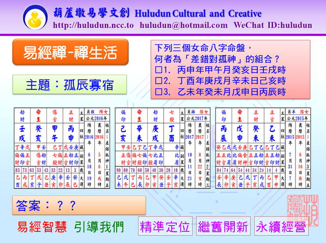 《神峰通考》專論女命篇之渭涇論提到,差錯對孤神,夫家零落。我們先不討論夫家是否真的家道中落,請問下列三個女命八字命盤,何者為「差錯對孤神」的組合?