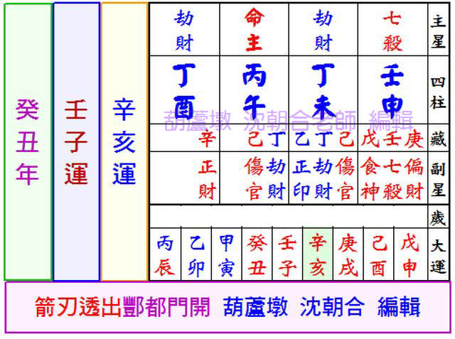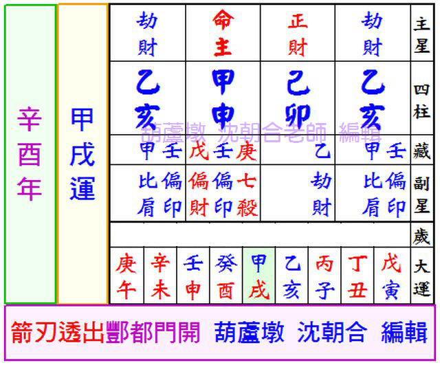 乃月刃格,月柱為劫財陽刃,辛亥運辛酉年卅九歲,命運歲陽刃冲,慘遭奇禍死於獄中。稍懂八字學員應該不難看出,辛亥運辛酉年卅九歲那年正逢箭刃透天干。