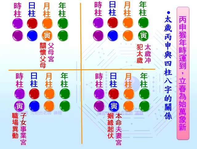 最簡單判斷法則是由喜用神定吉凶,兩組相同干支,即是雙倍力量。例如太歲丙申,大運丙申,若丙申干支與原命局不逢沖剋,且為喜用神,則加倍利益吉祥,若丙申沖壞了原局的喜用神,則產生加倍奉還、雙倍的殺傷力。每個人在一生行運當中都會遇到歲運併臨,但如果出現在第六步大運,則傷害力更具威脅。依此而推,男命生於陰曆1956年正月,今2016丙申年太歲干支將淬礪著本命八字流年運勢。