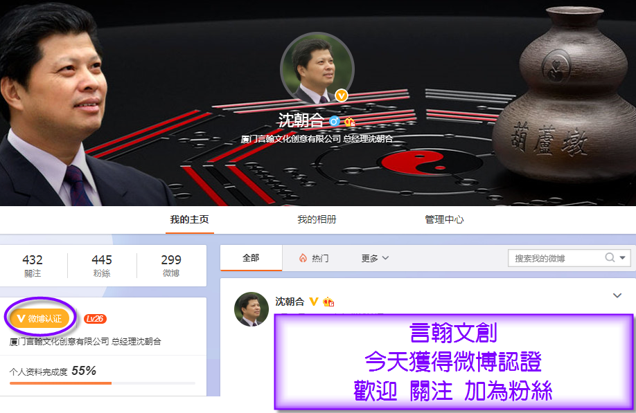 言翰文創 獲得微博認證 Posted on 2019 年 01 月 17 日 由 huludun 言翰文化創意有限公司 今天獲的 新浪微博 認證 歡迎 關注 加為粉絲 https://www.weibo.com/2429724507/profile?topnav=1&wvr=6&is_all=1 附圖:言翰文創獲得 新浪微博 認證