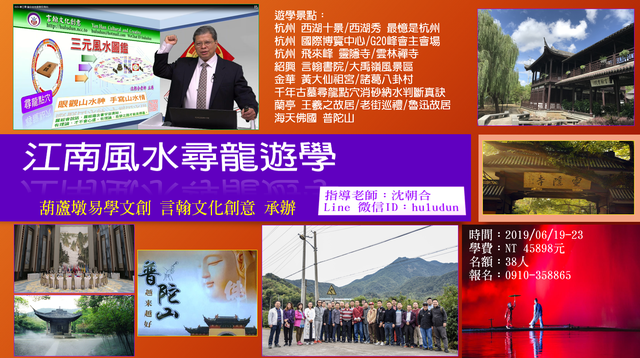 浙江大學在2012年邀約易學講座,每一班別超過百人次,連續兩年在浙大發揚易學文化。2014年展開易學菁英傳承培訓,今已邁入第五年,學習易經傳統文化儼然成為風潮。團體班學員常提議舉辦江南風水實踐課,殷殷期盼,為了不讓學員失望,近日用心規劃,「先知」學員得知此訊息,爭相預先訂位,原定名額28位,增加到38位,學訊還沒發佈,短短四天全部額滿。有意願參加、錯過這次學習機會的學員,沈老師在此向您說聲抱歉。第一次舉辦前往江南風水尋龍遊學,如果反應好、學員喜歡,我們2020年再安排舉行。(葫蘆墩沈朝合 微信ID:huludun)