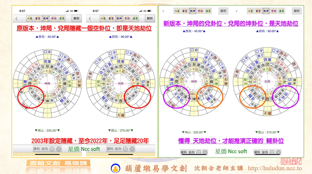 星都企業,星僑「乾坤風水」軟件(Ncc Soft)發表於2003年,程式判斷參數由我擔綱著作,坤局、兌局有一空卦位,這一空卦位即是「天地劫位」,足足隱藏了20年,今隨著《乾坤國寶菁萃》發行,同步揭開神秘面紗,使用者更新版即可使用,手機版稍等幾天。(葫蘆墩 沈朝合2022/10/05)
